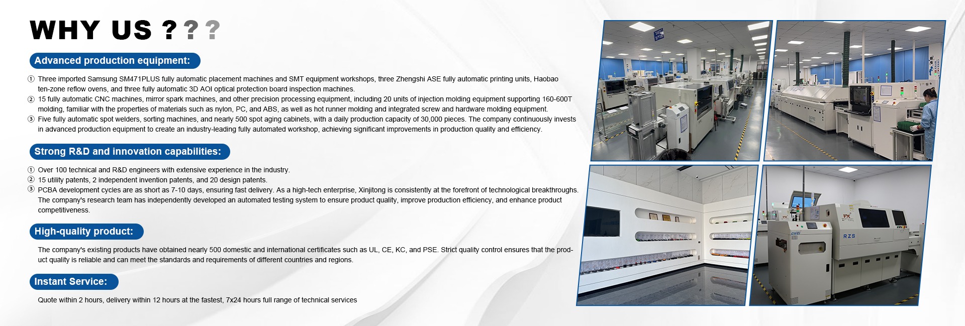 1. Brand Partner Program! XNJTG helps you succeed! 2. 12 years of PCBA industry experience helps you easily customize the functionality of your electronic products. 3. Our factory, located in Dongguan, covers 5,000 square meters and boasts a 50,000 square meter industrial park in Hubei. We employ nearly 500 people, including 50 in R&D and quality control, and operate over 30 production lines. 4. Our products hold numerous certifications in Europe and Southeast Asia, and have participated in the Hong Kong Electronics Fair (Autumn Edition) multiple times. 5. From blank board design to finished product production, we can complete your project within 7 days.